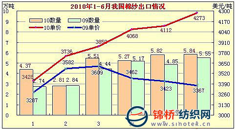 從棉紗線進口情況看,棉紗線進口數量持續(xù)3個月回落,進口價格繼續(xù)上揚。受印度、巴基斯坦等國限制紗線出口影響,2010年我國棉紗線進口激增現象有所緩解,棉紗線進口已經連續(xù)3個月出現回落。6月棉紗線進口8.25萬噸,同比、環(huán)比均下降12.2%。2010年3月棉紗線進口總量達11.18萬噸,這歷史單月進口最高水平,但是此后分別減至4月的10.29萬噸、5月的9.4萬噸和6月的8.25萬噸。1-6月棉紗線進口56.25萬噸,同比增長20.6%,增速較1-5月回落8.2個百分點。從進口均價看,呈持續(xù)上揚態(tài)勢,6月棉紗線進口均價2832美元/噸,同比上漲23%,環(huán)比漲4.7%,比2010年1月累計上漲400美元,漲幅16.4%。4月以來自巴基斯坦進口明顯減量,即由3月的3.71萬噸逐步回落至6月的1.33萬噸,上半年累計自巴基斯坦進口棉紗線17.44萬噸,同比增長10.9%,增速同比回落15.4個百分點。從進口均價看,呈逐月上漲態(tài)勢。自巴基斯坦進口價格雖然低于其它地區(qū),但是也呈逐月上漲態(tài)勢,即由1月的2239美元噸逐月上漲至6月的2538美元/噸,累計上漲299美元,累計漲幅13.4%。但是由于巴基斯坦限制棉紗線出口引起國內紡紗企業(yè)不瞞,巴基斯坦政府將可能調整紗線出口政策。同時隨著新花年度的開始和持續(xù)穩(wěn)定的國際棉價走勢影響,近期巴基斯坦紗價格開始止?jié)q企穩(wěn)或微幅下調,后期自巴基斯坦進口棉紗能否增加,拭目以待。