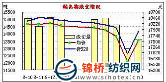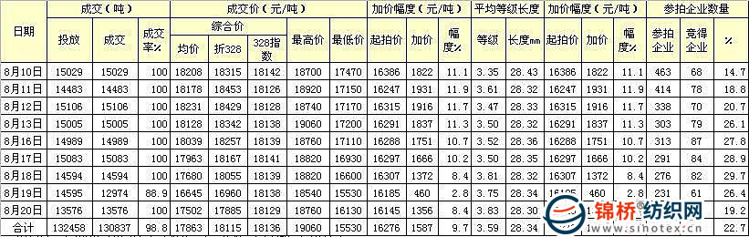 二是加價幅度逐日縮小,成交價逐日回落,價格水逐步低于現(xiàn)貨棉價。扣除8月19日非正常情況外,競拍成交價基本呈逐步回落態(tài)勢。從加價幅度看,成交價與起拍價相比,加價幅度呈逐步減少狀態(tài),即由最開始的平均每噸加1800-1900余元,縮小到后期的1350元左右,加價幅度由11%左右下降至8.4%。從每日成交均價看呈逐日下跌態(tài)勢,從13-18日,每日跌幅分別為103元、89元、76元、283元,20日比18日跌178元,從開拍以來,均價累計下跌了706元。折328級棉價,12-18日,每日跌幅分別為24元、87元、85元、90元、112元,20日比18日跌170元,折328級累計下跌了560余元元。與現(xiàn)貨328級棉價指數(shù)相比,競價折328級由高于現(xiàn)貨327元逐步減少至低于現(xiàn)貨棉價244元。