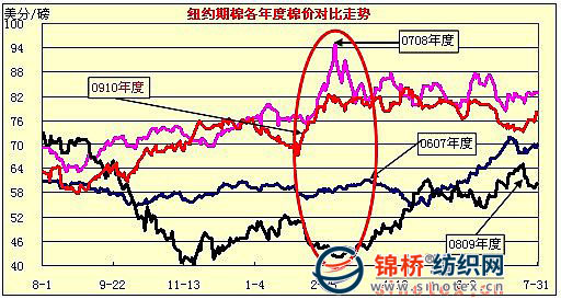 國際棉市09/10棉花年度即將結(jié)束,8月1日開始進入新棉年度。回顧本年度國際棉市,在2月巨幅拉升后,運行基本平穩(wěn),呈寬幅震蕩態(tài)勢。國內(nèi)棉價則表現(xiàn)出持續(xù)大幅上揚走勢,并在6月上旬刷新歷史紀錄。但是隨著6月紗線出口由強轉(zhuǎn)弱形勢變化,6月下旬紗價開始高位下調(diào),加上棉花進口配額下發(fā)和拋儲信息發(fā)布,持續(xù)大幅上漲的國內(nèi)現(xiàn)貨棉價在缺乏紗價支撐的情況下,7月開始止?jié)q小幅回調(diào),國內(nèi)期貨市場遠期合約也明顯走弱。