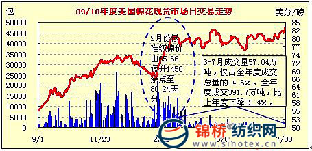 從美國棉花現(xiàn)貨市場交易情況看,價格走勢基本同于期棉,但是由于資源短缺,成交量大幅萎縮,其中自2月后大多日交易量為零,呈有價無量狀態(tài)。據(jù)美國農(nóng)業(yè)部網(wǎng)站公布,09/10年度美國現(xiàn)貨市場總成交量約20.15萬噸,比上一年度的31.2萬噸下降35.4%。其中2月后的5個月時間成交2.93萬噸,僅占全年度成交總量的14.6%。