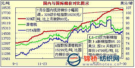 2.國內(nèi)現(xiàn)貨棉價7月小幅回落,期貨寬幅震蕩,紗價先于棉價下調(diào)。6月后半月持續(xù)火暴的紗線悄然轉(zhuǎn)弱,出口下降、價格回落。在缺乏棉紗支撐,加上棉花進口配額下發(fā)、拋儲信息發(fā)布和國家將加大對農(nóng)產(chǎn)品炒作打擊力度等因素影響,7月來游資開始紛紛逃離棉花、棉紗市場,棉紗價格大幅下跌,棉價開始止?jié)q下調(diào)。