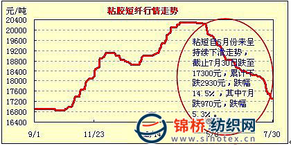 3.滌短跌后趨穩(wěn),粘短持續(xù)下跌。滌短在經(jīng)過5-6月由10650元跌持續(xù)下滑至9480元后,7月中上旬仍然貫性下行,但是下跌幅度縮小。7月下旬隨著聚酯原料底部反彈,滌短微有翅尾,滌短主體價由9300元又回復(fù)到9480元/噸。由于底部區(qū)域已經(jīng)基本形態(tài),隨著新棉上市推遲,短期內(nèi)滌短仍然將以小幅上行為主。