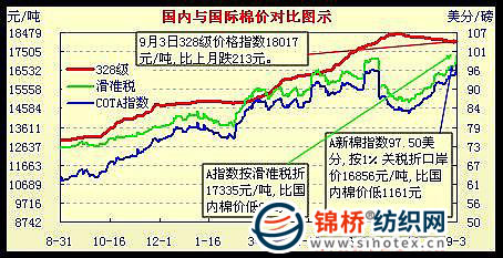 8月紐約期棉行情急速上揚(yáng),倉單達(dá)歷史新高。截止截止9月3日,紐約期棉主體價(jià)88.71美分/磅,8月累計(jì)上漲1064點(diǎn),漲幅13.6%,價(jià)格水平及漲幅均超過2010年2月。其中近期10月合約90.95美分/磅,漲859點(diǎn)。截止9月3日持倉總量22.31萬手,比7月末增倉5.61萬手,增倉和持倉量增創(chuàng)歷史新高。在紐約期棉引領(lǐng)下,CotlookA指數(shù)上漲至97.5美分/磅新高,較7月末大漲1230點(diǎn),漲幅達(dá)14.4%。與此同時(shí),外棉主港報(bào)價(jià)大幅上調(diào),截止9月3日,外棉M級(jí)主港報(bào)價(jià)101.03美分/磅,按滑準(zhǔn)稅折17932元/噸,分別較7月末漲1218點(diǎn)和2054元。在國際棉大幅飚漲和國內(nèi)棉價(jià)盤整情況下,內(nèi)外棉價(jià)價(jià)差大幅縮小,由3000元差距縮小至680-1160元左右。