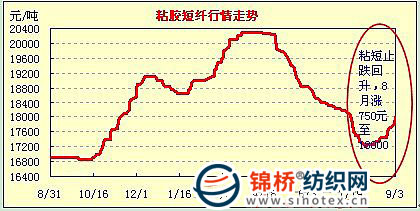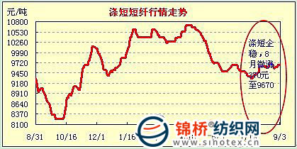 5.化纖短纖市場。8月滌綸短纖企穩(wěn),粘膠短纖止跌反彈。在行業(yè)專業(yè)會(huì)議后,8月粘膠短纖止跌回升,主體價(jià)18000元/噸,較7月末漲750元左右。滌綸短纖在庫存壓力不大和低價(jià)產(chǎn)品市場見少,滌綸短纖基本平穩(wěn),主體價(jià)基本在9670元/噸上下波動(dòng),較上月微升370元。