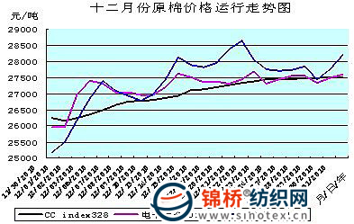 本月棉價最高價都出現在下旬,紐約棉期1103合約出現在21日,159.12美分/磅;鄭棉期貨1103合約出現在21日,28635元/噸;電子撮合1102合約出現在22日,27695元/噸;現貨CCindex328指數出現在31日,27508元/噸。(參見:12月原棉、化纖價格運行明細表和12月原棉價格運行走勢圖)