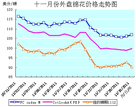 縱觀11月份的ICE期棉,乃是在弱勢(shì)運(yùn)行的行情中先揚(yáng)后抑,震蕩盤整中大幅下降的波動(dòng)走勢(shì)。全月都在圍繞著100美分/磅的價(jià)位上下波動(dòng),月末僅收于90美分/磅的價(jià)位之上,弱勢(shì)行情明顯。從ICE期棉1112合約來(lái)看,其運(yùn)行波峰在16日,波谷在22日。11月全月,紐約棉期1112合約累計(jì)大幅下降11.98美分/磅,降幅11.71%,月末運(yùn)行在90.31美分/磅價(jià)位上。國(guó)際棉花價(jià)格指數(shù)CotlookA(FE)累計(jì)大幅下降12.75美分/磅,降幅11.32%,月末運(yùn)行在99.85美分/磅價(jià)位上。中國(guó)進(jìn)口棉價(jià)格指數(shù)FCIndexM累計(jì)大幅下降9.55美分/磅,降幅8.19%,月末運(yùn)行在107.00美分/磅價(jià)位上。國(guó)際棉花指數(shù)ICindexM累計(jì)大幅下降18.26美分/磅,降幅14.83%,月末運(yùn)行在104.84美分/磅價(jià)位上。(參見(jiàn):表一和11月份外盤棉花價(jià)格走勢(shì)圖)