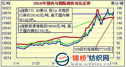 這一時期,在國內(nèi)棉價溫和整理的同時,紐約期棉則在美國經(jīng)濟數(shù)據(jù)趨好及印度棉花出口政策不穩(wěn)定的情況下,連續(xù)大幅反彈,并引領(lǐng)國際棉價持續(xù)上揚。在12月份的22個交易日中,紐約期棉有10個交易日觸及漲停板,主體價最高時達144美分以上,首期1103合約再刷歷史新高,最高沖至159美分。CotlookA指數(shù)攀升至186美分/磅新高,按滑準稅折口岸價達31600元以上,大大高于我國內(nèi)棉價。從走勢圖形看,12以來,由于國內(nèi)棉價對國際棉價走勢未給予反應(yīng),導(dǎo)致國際棉價首次大幅高于國內(nèi)棉價的同時,也使國際棉價漲勢受到抑制,回調(diào)震蕩整理。