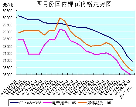 清明節(jié)假上班后,鄭棉期貨1105合約的價(jià)格跟漲外盤,波動(dòng)上漲,11日漲至本月最高價(jià)位29980元/噸后,就進(jìn)入了下跌通道,20~22日雖有三天的小幅反彈,但缺乏買盤的繼續(xù)支撐,難以持久,隨之繼續(xù)大幅下跌至月底。電子撮合1105合約的價(jià)格節(jié)假后也大幅跟漲外盤,11日漲至本月最高價(jià)位29185元/噸后,也進(jìn)入了下跌通道,21、22二日也有微小幅度的反彈表現(xiàn),但難抵棉市“潰退”的跌勢(shì),隨之也連續(xù)大幅下跌至月底?,F(xiàn)貨CCindex328指數(shù)的本月最高價(jià)位是1日由上月“承受”下來(lái)的30008元/噸,四月則是坐上“滑梯”,義無(wú)反顧的一溜3000余元/噸,直到月底,真是“玩”的痛快淋漓之極?。▍⒁?jiàn):四月份國(guó)內(nèi)棉花價(jià)格走勢(shì)圖)
