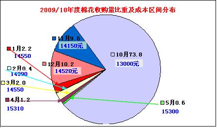 從新棉收購(gòu)及成本情況看,收購(gòu)量多集中于去年9-12月份,這一區(qū)間收購(gòu)量約占本年度新棉收購(gòu)總量的88.7%,平均收購(gòu)成本約為21900元/噸,為本年度來(lái)收購(gòu)成本最低區(qū)間。其中9-10月收購(gòu)402萬(wàn)噸,占68.7%,平均收購(gòu)成本20860元;11月份收購(gòu)69萬(wàn)噸,占11.7%,收購(gòu)成本26380元;12月份收購(gòu)48萬(wàn)噸,占8.3%,收購(gòu)成本24200元/噸。而本年度收購(gòu)成本最高區(qū)間較為集中于今年2、3月份,收購(gòu)成本分別達(dá)27060元和27780元/噸,但這一區(qū)間收購(gòu)量分別僅為20和14萬(wàn)噸,僅占收購(gòu)總量5.8%。