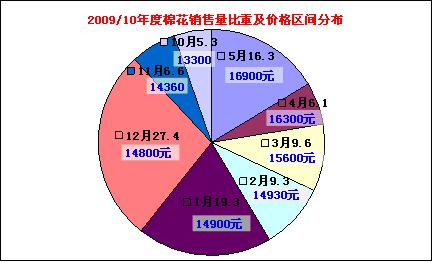 與上一年度相比,從收購(gòu)進(jìn)度看與今年基本相似,收購(gòu)量相對(duì)集中于9-10月份,兩月收購(gòu)471萬(wàn)噸,占當(dāng)年收購(gòu)總量的73.8%,收購(gòu)均價(jià)為13000元/噸。但棉花銷(xiāo)售價(jià)格變動(dòng)幅度不大,銷(xiāo)售坡度也相對(duì)均穩(wěn)。