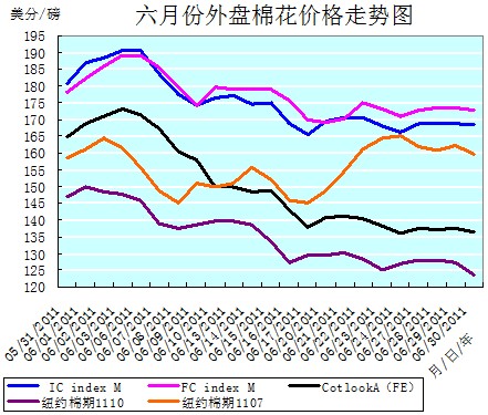6月全月,中國進(jìn)口棉價(jià)格指數(shù)FCIndexM、國際棉花指數(shù)ICindexM分別累計(jì)下跌5.49美分/磅、12.41美分/磅,下跌幅度分別3.08%、6.86%。唯有交割的紐約棉期1107合約全月累計(jì)上漲1.12美分/磅,漲幅0.71%。(參見:表一和6月份外盤棉花價(jià)格走勢圖)