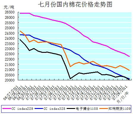 7月全月,鄭棉期貨1109合約、電子撮合1108合約、中國棉花價格指數(shù)CCindex328全月分別累計下降2880元/噸、2982元/噸、3933元/噸,降幅分別12.08%、12.96%、16.35%。月末分別運行在20955元/噸、20030元/噸、20123元/噸的價位上。