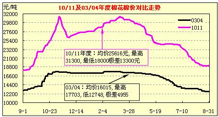 從今年棉花市場(chǎng)總體運(yùn)行情況看,與03/04年度極為相似,其相似之處表現(xiàn)在二個(gè)方面:一是棉價(jià)走勢(shì)軌跡相似,暴漲暴跌后均回到起點(diǎn);二是暴跌后導(dǎo)致企業(yè)經(jīng)營(yíng)維艱,虧損加劇,停產(chǎn)、半停產(chǎn)、倒閉企業(yè)增加。不同點(diǎn)是今年的價(jià)格水平和漲跌幅度大大高于03/04年度。如下圖: