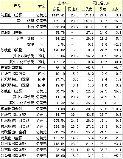 從主要產(chǎn)品出口數(shù)量看,服裝出口數(shù)量基本持平,但紗布出口,尤其是棉制紗布出口明顯下降。據(jù)海關(guān)統(tǒng)計(jì),上半年,我國(guó)紗線出口170.62萬(wàn)噸,同比增長(zhǎng)5.8%。其中一季度增長(zhǎng)24.7%,二季度同比下降8.8%。上半年出口棉紗線23.84萬(wàn)噸,同比下降20.2%,其中一季度下降1.5%,二季度下降34.2%。上半年化纖紗線出口105.12萬(wàn)噸,同比增長(zhǎng)16.8%,其中一季度增長(zhǎng)39.7%,二季度下降0.4%。上半年棉布出口36.1億米,同比下降1.9%,其中一季度微增3.1%,二季度下降5.8%。上半年出口化纖布70.1億米,其中一季度增長(zhǎng)9.9%,二季度增長(zhǎng)18.9%。上半年針織服裝出口97.74億件,同比微增3.5%,其中一季度增長(zhǎng)2.4%,二季度增長(zhǎng)4.3%。上半年梭織服裝出口19.67億件,同比微降0.1%,其中一季度增長(zhǎng)1.6%,二季度下降1.5%。(見(jiàn)附表二)