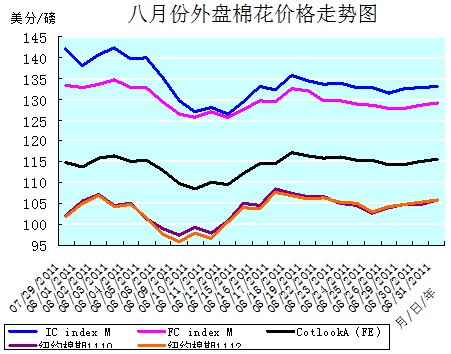 縱觀八月份的ICE期棉,乃是在弱勢震蕩行情中呈凹形波動(dòng),總體上小幅上漲的曲折走勢,運(yùn)行谷底在9日,波峰在17日。八月全月,紐約棉期1110合約累計(jì)上漲了3.80美分/磅,漲幅為3.72%,月末運(yùn)行在105.88美分/磅的價(jià)位上。國際棉花價(jià)格指數(shù)CotlookA(FE)累計(jì)上漲了0.70美分/磅,漲幅為0.61%,月末運(yùn)行在115.60美分/磅的價(jià)位上。中國進(jìn)口棉價(jià)格指數(shù)FCIndexM累計(jì)下降了4.38美分/磅,降幅為3.28%,月末運(yùn)行在129.03美分/磅的價(jià)位上。國際棉花指數(shù)ICindexM累計(jì)下降了8.99美分/磅,降幅為6.32%,月末運(yùn)行在133.15美分/磅的價(jià)位上。(參見:表一和八月份外盤棉花價(jià)格走勢圖)