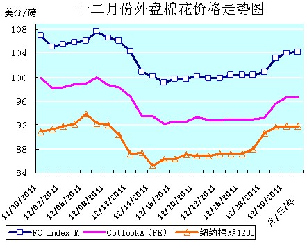 2011年收官的12月份,在大雪、冬至二節(jié)氣日緊一日的寒風(fēng)侵襲下,花紗布市場行情亦如“一九二九不出手”的天氣一樣,除了冷,還是冷——疲弱的行情冷、清淡的交易也是冷。但是正如古人“冬至一陽生”的說法一樣,“陰極之至,陽氣始生”。12月份花紗布市場行情亦在寒冬籠罩之中“一陽初生”,總體上表現(xiàn)為在弱勢趨穩(wěn)之后,盤整中微幅爬升的平穩(wěn)運行。外盤棉價在美國經(jīng)濟數(shù)據(jù)利好的“提振”下,微幅盤整升漲,走勢趨穩(wěn);國棉在新棉收儲的“權(quán)衡”下,現(xiàn)貨、電撮價格盤整微升,鄭棉期貨價格盤整下降,三者都在逐步向收儲價格靠攏;棉型短纖價格止跌反彈,連續(xù)小幅回升,弱勢穩(wěn)行;紗布價格降幅大幅收縮,個別品種還有微幅的上調(diào)。