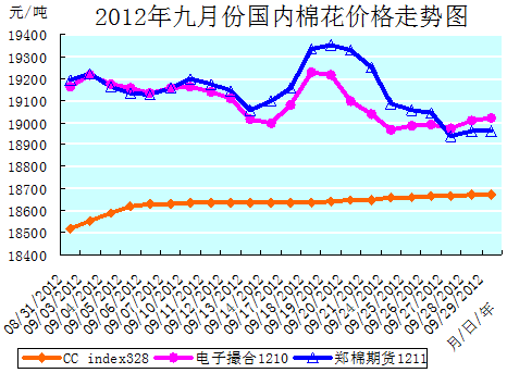 9月份,鄭棉期貨1211合約累計(jì)下降255元/噸,降幅1.17%,月末運(yùn)行在18965元/噸的價(jià)位上;電子撮合1210合約累計(jì)下降141元/噸,降幅0.74%,月末運(yùn)行在19021元/噸的價(jià)位上;中國棉花價(jià)格指數(shù)CCindex328累計(jì)上漲153元/噸,漲幅0.83%,月末運(yùn)行在18673元/噸的價(jià)位上。期、現(xiàn)棉價(jià)仍然同處于18500元/噸的價(jià)位之上,且現(xiàn)貨棉價(jià)低于電子撮合1210合約棉價(jià)348元/噸,低于鄭棉期貨1211合約棉價(jià)292元/噸。(參見:表一和2012年9月份國內(nèi)棉花價(jià)格走勢(shì)圖)
