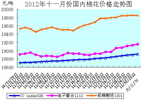 11月份全月統(tǒng)計(jì):鄭棉期貨1301合約累計(jì)上漲了325元/噸,漲幅為1.66%,月末運(yùn)行在19850元/噸的價(jià)位上;電子撮合1212合約累計(jì)大幅上漲了251元/噸,漲幅為1.33%,月末運(yùn)行在19160元/噸的價(jià)位上;中國(guó)棉花價(jià)格指數(shù)CCindex328累計(jì)上漲了209元/噸,漲幅為1.12%,月末運(yùn)行在18918元/噸的價(jià)位上。月末,現(xiàn)貨CCindex328價(jià)格比鄭棉期貨1301合約低了932元/噸、比電子撮合1212合約低了242元/噸。(參見(jiàn):表一和2012年11月份國(guó)內(nèi)棉花價(jià)格走勢(shì)圖)