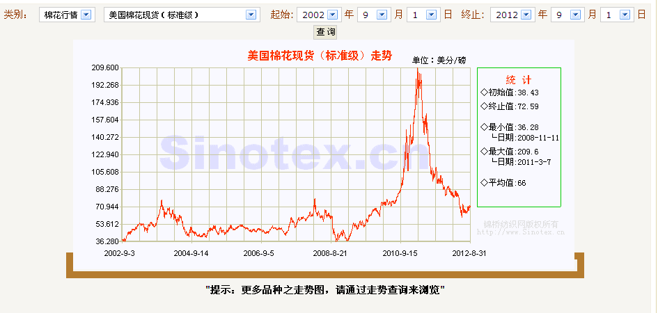 根據(jù)錦橋紡織網(wǎng)資料分析,美國(guó)棉花價(jià)格十年間上漲了88.9%。 美棉現(xiàn)貨標(biāo)準(zhǔn)級(jí)(SM) 十年間最高價(jià)格點(diǎn)出現(xiàn)在2011年3月7日,為209.6美分/磅,漲幅達(dá)445%。最低價(jià)格出現(xiàn)在2008年11月11日,價(jià)格波動(dòng)幅度達(dá)4.8倍,可謂波動(dòng)劇烈。 從美棉現(xiàn)貨價(jià)格走勢(shì)曲線看(http://www.qdhqly.cn/price/MakePic.asp?code=1002),兩次大的波動(dòng)分別發(fā)生在2002-2004年,2009-2012年這兩個(gè)時(shí)間段。與中國(guó)棉花價(jià)格的波動(dòng)區(qū)間基本一致。說(shuō)明美國(guó)棉花市場(chǎng)已經(jīng)與中國(guó)棉花市場(chǎng)密切相關(guān),亦與中國(guó)的棉花進(jìn)口政策有很大關(guān)系。