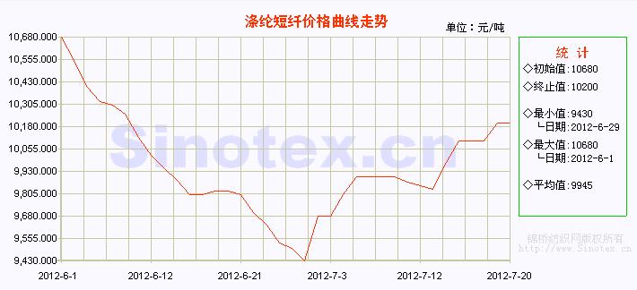 本周(7.16-7.20),上游原料市場強勢上漲帶動成本上升,下游適度補貨,加之市場炒作因素的作用,滌綸短纖價格上漲。周初受原料抬漲提振,滌短廠家主動漲價意愿強烈,交投氣氛活躍,交易重心上移,17日(周二)滌短價格重返萬元以上。18、19兩日(周三、周四),市場觀望氣氛濃厚,炒作氣氛趨淡,價格高位盤整為主。受油價調(diào)升影響,20日(周五)市場再現(xiàn)漲勢。當前,1.4D直紡滌綸短纖市場中心價為10200元/噸,較上周上調(diào)400元/噸。