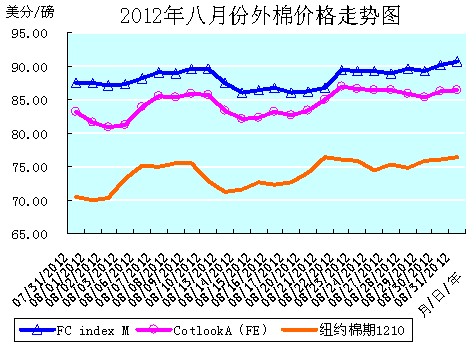 全月統(tǒng)計(jì):紐約棉期1210合約累計(jì)大幅上漲了5.90美分/磅,漲幅為8.36%,月末運(yùn)行在76.48美分/磅的價(jià)位上。國際棉花價(jià)格指數(shù)CotlookA(FE)累計(jì)大幅上漲了3.30美分/磅,漲幅為3.97%,月末運(yùn)行在86.50美分/磅的價(jià)位上。中國進(jìn)口棉價(jià)格指數(shù)FCIndexM累計(jì)大幅上漲了3.28分/磅,漲幅為3.75%,月末運(yùn)行在90.79美分/磅的價(jià)位上。八月末,中國進(jìn)口棉價(jià)格指數(shù)FCIndexM仍分別高于國際棉花價(jià)格指數(shù)CotlookA(FE)和近期ICE期棉1210合約4.29美分/磅、14.31美分/磅,價(jià)差比上月有所收縮。(參見:表一和2012年8月份外棉價(jià)格走勢圖)