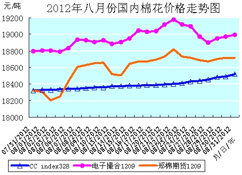 8月份,鄭棉期貨1209合約累計(jì)上漲了390元/噸,漲幅為2.13%,月末運(yùn)行在18715元/噸的價(jià)位上;電子撮合1209合約累計(jì)上漲了197元/噸,漲幅為1.05%,月末運(yùn)行在18995元/噸的價(jià)位上;中國棉花價(jià)格指數(shù)CCindex328累計(jì)上漲了197元/噸,漲幅為1.08%,月末運(yùn)行在18520元/噸的價(jià)位上。期、現(xiàn)棉價(jià)仍同處于18000元/噸的價(jià)位之上,且現(xiàn)貨棉價(jià)還要低于電子撮合1209合約棉價(jià)475元/噸,而僅低于鄭棉期貨1209合約棉價(jià)195元/噸。(參見:表一和2012年8月份國內(nèi)棉花價(jià)格走勢圖)