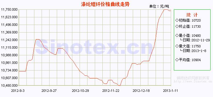本周(1.7-1.11),前兩日滌綸短纖行情慣性小幅上調(diào),周三開始上游原料PTA、MEG、聚酯切片市場行情出現(xiàn)松動,進(jìn)行調(diào)整,滌綸短纖市場詢盤氣氛清淡,觀望氣氛增加,市場成交一般,高位盤整。下游聚酯滌綸產(chǎn)銷率轉(zhuǎn)向低迷,多數(shù)在30%-50%。因聚酯產(chǎn)品庫存處在低位,產(chǎn)品價(jià)格持穩(wěn)。當(dāng)前,1.4D直紡滌綸短纖市場中心價(jià)在11730元/噸,累計(jì)上漲80元/噸,漲幅0.69%。