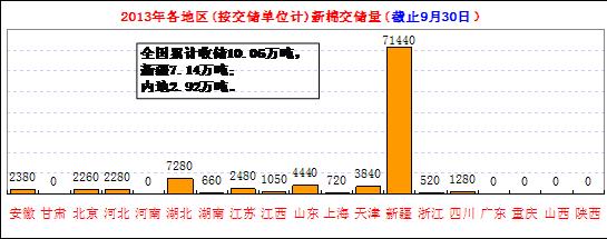 2、收儲(chǔ)量同比下降7成。今年棉花收儲(chǔ)除在提高保證金和改變結(jié)算方式外,在收儲(chǔ)質(zhì)量上也嚴(yán)于往年,導(dǎo)致收儲(chǔ)量大減。截止9月30日,全國累計(jì)交儲(chǔ)10.06萬噸,同比下降73.7%。其中新疆交儲(chǔ)7.14萬噸,下降75.7%;湖北7280噸,下降24.8%。去年交儲(chǔ)主力的山東、河北分別下降79.6%和91%。