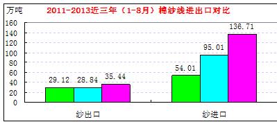 4、3年棉紗進(jìn)口激增1.5倍,進(jìn)口紗價(jià)面臨下行壓力。近3年來我國棉紗線進(jìn)口猛增,3年進(jìn)口增長1.5倍,占我國紗總產(chǎn)量的比重由2011年的2.9%提高到今年的6.1%。我國棉紗線出口3年僅增長21.7%,為進(jìn)口總量的1/5,僅占我國紗總產(chǎn)的1.6%。