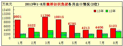 魏橋紡織股份今年出口大幅增長,1-8月出口5.73億美元,同比增長150.8%。以對(duì)日本出口為主的綺麗和諸城服裝8月份出口同比分別下降12.7%和21%,1-8月分別出口1.83億美元和1.4億美元,同比增長2.5%和12.1%。