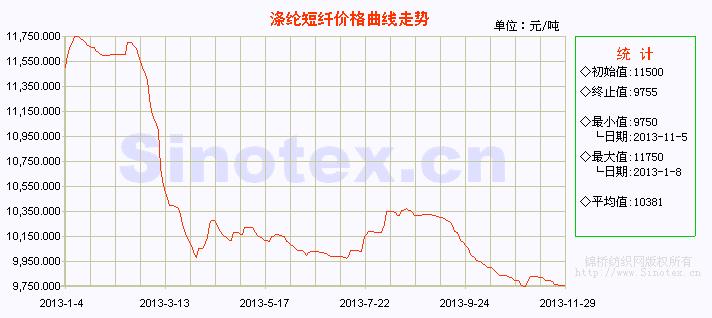 11月份滌綸短纖有所震蕩。滌綸短纖價格在11月5日觸及年內(nèi)低點(diǎn)9750元/噸之后,下游企業(yè)有一波集中補(bǔ)貨,滌綸短纖價格隨之上漲80元/噸后盤整。但由于原料弱勢調(diào)整,下游需求不佳,從下半月開始滌綸短纖再度步入陰跌趨勢,僵持清淡,聚酯產(chǎn)業(yè)鏈信心缺乏。11月份滌綸短纖累計(jì)下跌45元/噸,跌幅0.46%。