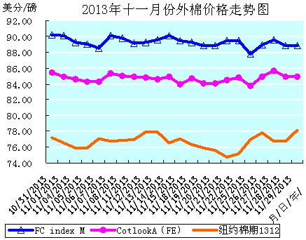 11月份全月統(tǒng)計:紐約棉期1312合約累計小幅上漲0.96美分/磅,漲幅1.24%,月末運行在78.14美分/磅價位上,仍在80美分/磅整數(shù)價位之下運行。國際棉花價格指數(shù)CotlookA(FE)累計小幅下降0.50美分/磅,降幅0.59%,月末運行在84.90美分/磅價位上。中國進口棉價格指數(shù)FCIndexM累計小幅下降1.39美分/磅,降幅1.54%,月末運行在88.85美分/磅價位上。11月末,中國進口棉價格指數(shù)FCIndexM分別高于近期ICE期棉1312合約和國際棉花價格指數(shù)CotlookA(FE)10.71美分/磅、3.95美分/磅。(參見:表一和2013年11月份外棉價格走勢圖)