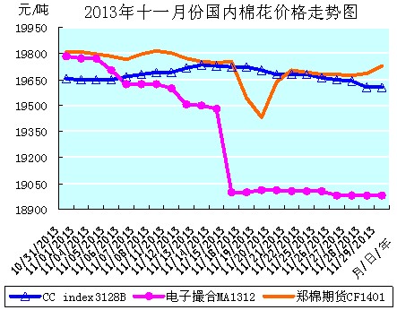 11月份全月統(tǒng)計:中國棉花價格指數(shù)CCindex3128B累計小幅下降48元/噸,降幅0.24%,月末運行在19603元/噸價位上;電子撮合1312合約累計超大幅下降801元/噸,降幅4.05%,月末運行在18980元/噸價位上;鄭棉期貨1401合約累計小幅下降85元/噸,降幅0.43%,月末運行在19725元/噸價位上。月末,現(xiàn)貨CCindex3128B價格比電子撮合1312合約高623元/噸、比鄭棉期貨1401合約低122元/噸。(參見:表一和2013年11月份國內(nèi)棉花價格走勢圖)