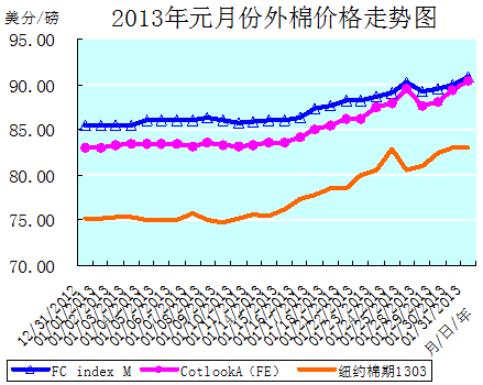 元月份全月統(tǒng)計(jì):紐約棉期1303合約累計(jì)大幅上漲了7.81美分/磅,漲幅為10.39%,月末運(yùn)行在82.95美分/磅的價(jià)位上。國(guó)際棉花價(jià)格指數(shù)CotlookA(FE)累計(jì)大幅上漲了7.10美分/磅,漲幅為8.92%,月末運(yùn)行在90.35美分/磅的價(jià)位上。中國(guó)進(jìn)口棉價(jià)格指數(shù)FCIndexM累計(jì)大幅上漲了5.36美分/磅,漲幅為6.28%,月末運(yùn)行在90.77美分/磅的價(jià)位上。元月末,中國(guó)進(jìn)口棉價(jià)格指數(shù)FCIndexM仍分別高于近期ICE期棉1303合約和國(guó)際棉花價(jià)格指數(shù)CotlookA(FE)7.82美分/磅、0.42美分/磅。(參見(jiàn):表一和2013年元月份外棉價(jià)格走勢(shì)圖)