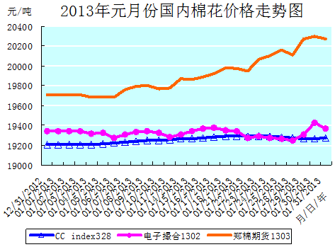 元月份全月統(tǒng)計(jì):中國(guó)棉花價(jià)格指數(shù)CCindex328累計(jì)小幅上漲了70元/噸,漲幅為0.36%,月末運(yùn)行在19271元/噸的價(jià)位上;電子撮合1302合約累計(jì)微幅上漲了28元/噸,漲幅為0.14%,月末運(yùn)行在19367元/噸的價(jià)位上;鄭棉期貨1303合約累計(jì)大幅上漲了560元/噸,漲幅為2.84%,月末運(yùn)行在20270元/噸的價(jià)位上。月末,現(xiàn)貨CCindex328價(jià)格比電子撮合1302合約低了96元/噸、比鄭棉期貨1303合約低了999元/噸。(參見(jiàn):表一和2013年元月份國(guó)內(nèi)棉花價(jià)格走勢(shì)圖)