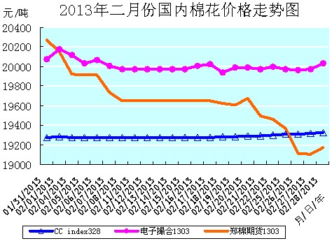 二月份全月統(tǒng)計:中國棉花價格指數(shù)CCindex328累計微幅上漲了54元/噸,漲幅為0.28%,月末運行在19325元/噸的價位上;電子撮合1303合約累計微幅下降了36元/噸,降幅為0.19%,月末運行在20036元/噸的價位上;鄭棉期貨1303合約累計大幅下降了1095元/噸,降幅為5.40%,月末運行在19175元/噸的價位上。月末,現(xiàn)貨CCindex328價格比電子撮合1303合約低了711元/噸、比鄭棉期貨1303合約高150元/噸。(參見:表一和2013年二月份國內(nèi)棉花價格走勢圖)