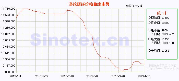 滌綸短纖自2月下旬開始進(jìn)入下跌通道,上周出現(xiàn)了短暫的反彈,本周再度疲軟回調(diào)。上周的反彈和本周的下調(diào)都與上游原料的漲跌有直接的聯(lián)系。本周前兩日,外圍大宗商品持續(xù)大幅回調(diào),影響資本市場心態(tài),原料PX及PTA期貨大跌。滌綸短纖市場氣氛觀望,主流廠家價格基本平報,下游多消化前期庫存,商談氣氛清淡。周三以后,外圍氣氛有所緩和,原料降幅減弱,聚酯大盤整體氣氛疲弱。滌短行情弱勢僵持格局,小幅報跌,市場有價無市,持續(xù)觀望,成交商談優(yōu)惠為主。滌綸短纖企業(yè)產(chǎn)銷率下滑,庫存量基本保持平穩(wěn),平均在十天左右水平。滌短行業(yè)的開機(jī)負(fù)荷水平保持平穩(wěn),未來有小幅下跌的可能。周五,1.4D×38mm滌綸短纖市場中心價在10170元/噸,本周累計(jì)下跌110元/噸,跌幅1.07%。