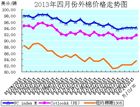 自4日至24日連續(xù)盤降的頹弱走勢,主要是因在繼續(xù)承受疲軟的經(jīng)濟面[如美國就業(yè)數(shù)據(jù)不佳(美國3月份非農(nóng)就業(yè)人數(shù)增加88,000人,增幅低于市場預(yù)計的200,000人。)],以及需求減少的壓力下,又逢股市及外部商品市場普遍大跌[如15日外部貴金屬及原油期貨領(lǐng)跌(CRB指數(shù)錄得2011年12月來最大單日跌幅,黃金創(chuàng)下1983年來最大兩天跌幅,布蘭特原油觸及7月來最低,美國股市擴大跌幅。美國波士頓連環(huán)爆炸也對金融市場形成強力沖擊。),其他谷物市場也全面走低。];加之又受到中國公布的經(jīng)濟數(shù)據(jù)弱于預(yù)期[據(jù)中國國家統(tǒng)計局發(fā)布數(shù)據(jù)顯示,一季度國內(nèi)生產(chǎn)總值(GDP)同比增長7.7%,增速不僅低于去年同期,也低于2012年四季度,即同比、環(huán)比增速均回落。3月份出口數(shù)據(jù)下滑也令人失望。]和中國制造業(yè)數(shù)據(jù)疲弱[23日匯豐公布,4月份中國制造業(yè)采購經(jīng)理人預(yù)覽指數(shù)降至50.5(3月份終值為51.6)。4月新出口訂單分項指數(shù)初值亦下滑,從上月終值50.5降至48.6的六個月低位,為四個月來首度降至榮枯線下方,出口形勢依然嚴(yán)峻。]所導(dǎo)致的市場憂慮中國經(jīng)濟增速放緩,進而加重了對全球經(jīng)濟的擔(dān)憂;另外近期ICE期棉1305合約24日進入第一交割通知日,投資者在5月合約期滿前繼續(xù)結(jié)清頭寸也對市場形成壓力,諸多利空令I(lǐng)CE期棉承壓。其間雖也有中國收儲政策公布對棉市形成的提振;美國消息面利好(美聯(lián)儲最新政策會議紀(jì)要強調(diào)繼續(xù)維持寬松貨幣政策以支持經(jīng)濟),提振股市及商品市場整體上揚等利好的支持。但終歸是壓力(利空)大于推力(利好)。ICE期棉還是在寬幅盤整中一路下跌(如4日-9日的“四連陰”,近期ICE期棉1305合約累計下降了4.58美分/磅,降幅為5.13%。)。但價格的降落,卻使得市場交易相對活躍。