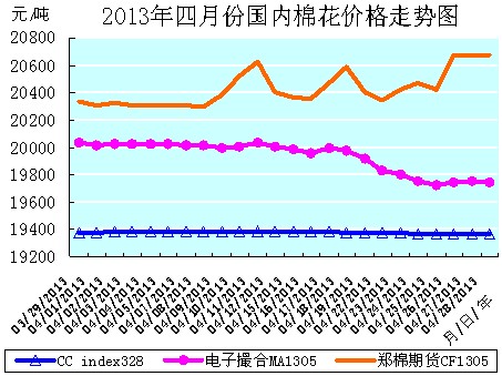 4月份全月統(tǒng)計:中國棉花價格指數(shù)CCindex328累計微幅下降了13元/噸,降幅為0.07%,月末運行在19362元/噸的價位上;電子撮合1305合約累計大幅下降了288元/噸,降幅為1.44%,月末運行在19743元/噸的價位上;鄭棉期貨1305合約累計大幅上漲了340元/噸,漲幅為1.67%,月末運行在20670元/噸的價位上。月末,現(xiàn)貨CCindex328價格比電子撮合1305合約低了381元/噸、比鄭棉期貨1305合約低了1308元/噸。(參見:表一和2013年4月份國內(nèi)棉花價格走勢圖)