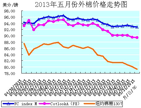 5月份全月統(tǒng)計(jì):紐約棉期1307合約累計(jì)大幅下降了8.11美分/磅,降幅為9.27%(為八個(gè)月來最大月度跌幅),月末運(yùn)行在79.36美分/磅的價(jià)位上,跌破了80美分/磅的整數(shù)價(jià)位。國際棉花價(jià)格指數(shù)CotlookA(FE)累計(jì)大幅下降了3.80美分/磅,降幅為4.08%,月末運(yùn)行在89.40美分/磅的價(jià)位上。中國進(jìn)口棉價(jià)格指數(shù)FCIndexM累計(jì)中幅下降了1.39美分/磅,降幅為1.48%,月末運(yùn)行在92.81美分/磅的價(jià)位上。5月末,中國進(jìn)口棉價(jià)格指數(shù)FCIndexM仍分別高于近期ICE期棉1307合約和國際棉花價(jià)格指數(shù)CotlookA(FE)13.45美分/磅、3.41美分/磅。(參見:表一和2013年5月份外棉價(jià)格走勢圖)