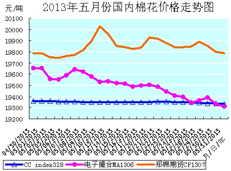 電子盤中電子撮合棉價(jià)的現(xiàn)貨屬性盡顯,仍是在窄幅盤整中弱勢運(yùn)行,緩緩下滑,累計(jì)擴(kuò)幅續(xù)降的疲弱走勢。月初的幾個(gè)工作日,電子撮合棉價(jià)小幅震蕩,先抑后揚(yáng),累計(jì)基本持平并盤升至本月的最高價(jià)位,如電子撮合MA1306合約于7日盤升至19643元/噸的本月最高價(jià)位,累計(jì)下降了11元/噸,降幅為0.06%。隨后便進(jìn)入了直至月底的微幅盤降的通道,如電子撮合MA1306合約期間累計(jì)下降了328元/噸,降幅為1.67%,且月末30日、31日二天的價(jià)格,已經(jīng)低于中國棉花價(jià)格指數(shù)CCindex328當(dāng)日的價(jià)格。(參見:表一和2013年5月份國內(nèi)棉花價(jià)格走勢圖)