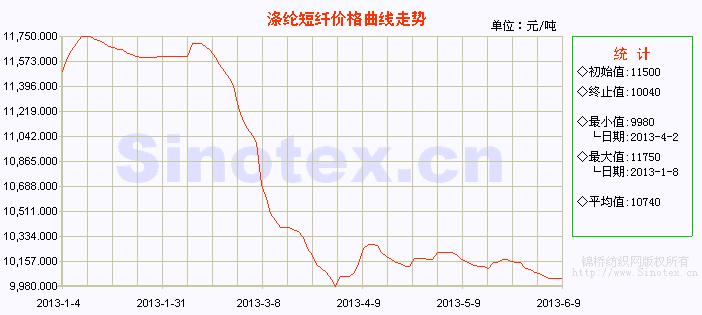 (數(shù)據(jù)來(lái)源:錦橋紡織網(wǎng)曲線欄目) 本周(6.3-6.9)滌綸短纖繼續(xù)疲軟下跌。近期原油的大幅反彈并未帶動(dòng)聚酯原料整體好轉(zhuǎn),出現(xiàn)分歧;下游市場(chǎng)對(duì)滌短節(jié)前補(bǔ)貨力度低于預(yù)期,整體信心不足。滌綸短纖大單補(bǔ)貨意愿不強(qiáng),市場(chǎng)交投氣氛不振,市場(chǎng)成交量較上周下滑。廠家報(bào)價(jià)虛高,實(shí)際成交商談空間加大,成交重心繼續(xù)陰跌,南方地區(qū)萬(wàn)元關(guān)口岌岌可危。當(dāng)前滌綸短纖企業(yè)的產(chǎn)銷(xiāo)率基本保持平穩(wěn),維持在60-70%。庫(kù)存量在一周以上水平。滌綸短纖行業(yè)的開(kāi)工率保持平穩(wěn),預(yù)計(jì)后市變化不大。周末,1.4D×38mm滌綸短纖市場(chǎng)價(jià)格運(yùn)行在10040元/噸(比當(dāng)日國(guó)內(nèi)328級(jí)棉花現(xiàn)貨價(jià)格低9281元/噸),本周累計(jì)下跌70元/噸,跌幅0.69%。 本周原油大幅反彈。周一,中東和北非多個(gè)國(guó)家政局的不穩(wěn)定使得石油供應(yīng)層面的風(fēng)險(xiǎn)加劇,美元下跌,油價(jià)受到支撐,7月主力原油合約大漲1.48美元,收于每桶93.45美元。周二,由于沒(méi)有明顯市場(chǎng)事件的驅(qū)動(dòng),油價(jià)微跌14美分收于每桶93.31美元。,周三,美國(guó)商品原油庫(kù)存大幅減少了630萬(wàn)桶,遠(yuǎn)超預(yù)期,油價(jià)受到供應(yīng)層面支持上漲至93.74美元。因美元大幅下跌,且在就業(yè)數(shù)據(jù)公布之前,市場(chǎng)對(duì)美國(guó)經(jīng)濟(jì)復(fù)蘇力度的擔(dān)憂有所升溫。周四主力原油合約上漲1.02美元報(bào)94.76美元。周五,美國(guó)就業(yè)人數(shù)溫和上升提振原油,有幾家上漲1.27美元收于96.03美元/桶。本周主力合約累計(jì)上漲4.06美元,漲幅4.4%。 化纖原料價(jià)格運(yùn)行明細(xì)表