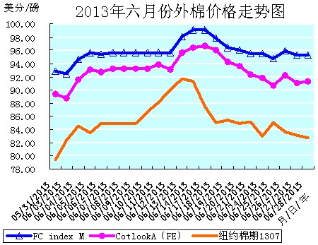 6月份全月統(tǒng)計(jì):紐約棉期1307合約累計(jì)大幅上漲了3.35美分/磅,漲幅為4.22%,月末運(yùn)行在82.71美分/磅的價(jià)位上,又回歸80美分/磅的整數(shù)價(jià)位之上運(yùn)行。國(guó)際棉花價(jià)格指數(shù)CotlookA(FE)累計(jì)中幅上漲了1.90美分/磅,漲幅為2.13%,月末運(yùn)行在91.30美分/磅的價(jià)位上。中國(guó)進(jìn)口棉價(jià)格指數(shù)FCIndexM累計(jì)中幅上漲了2.50美分/磅,漲幅為2.69%,月末運(yùn)行在95.31美分/磅的價(jià)位上。六月末,中國(guó)進(jìn)口棉價(jià)格指數(shù)FCIndexM仍分別高于近期ICE期棉1307合約和國(guó)際棉花價(jià)格指數(shù)CotlookA(FE)12.60美分/磅、4.01美分/磅。(參見:表一和2013年6月份外棉價(jià)格走勢(shì)圖)