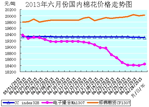 6月份全月統(tǒng)計(jì):中國(guó)棉花價(jià)格指數(shù)CCindex328累計(jì)微幅下降了36元/噸,降幅為0.19%,月末運(yùn)行在19300元/噸的價(jià)位上;電子撮合1307合約累計(jì)大幅下降了930元/噸,降幅為4.80%,月末運(yùn)行在18447元/噸的價(jià)位上;鄭棉期貨1307合約累計(jì)中幅上漲了235元/噸,漲幅為1.19%,月末運(yùn)行在20025元/噸的價(jià)位上。月末,現(xiàn)貨CCindex328價(jià)格比電子撮合1307合約高了853元/噸、比鄭棉期貨1307合約低了725元/噸。(參見:表一和2013年6月份國(guó)內(nèi)棉花價(jià)格走勢(shì)圖)