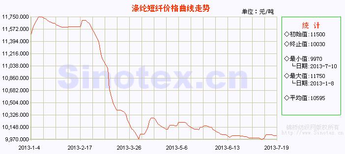 (數(shù)據(jù)來源:錦橋紡織網(wǎng)曲線欄目) 本周(7.15-19),滌綸短纖穩(wěn)中顯弱,僵持前行。廠商維持平報,實際成交多可適度商談。滌綸短纖下游信心不足,市場表現(xiàn)平淡,觀望氣氛濃厚,產(chǎn)品消化不暢。滌綸短纖企業(yè)產(chǎn)銷率小幅下滑,庫存水平維持,平均在十天左右,低者在一周左右。滌短行業(yè)的開機負荷水平保持平穩(wěn)。7月19日,1.4D×38mm滌綸短纖市場價格運行在10030元/噸(比當(dāng)日國內(nèi)328級棉花現(xiàn)貨價格低9226元/噸),本周累計下跌10元/噸,跌幅0.10%。 本周紐約原油仍以上漲為主。18日(周四),好于市場預(yù)期的美國經(jīng)濟數(shù)據(jù)助長了市場樂觀情緒,原油價格受到鼓勵大漲至16個月以來的最高水平,8月主力原油合約收高在每桶108.04美元。原油價格本周上漲了2%,是油價連續(xù)第四次按周收漲;過去四周內(nèi)的累計漲幅是14.6%,7月至今的漲幅接近12%。 化纖原料價格運行明細表