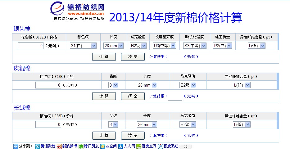 2013年9月1日起國家棉花新標(biāo)準(zhǔn)和新的棉花價(jià)格體系開始實(shí)施。計(jì)算方法相對復(fù)雜。為方便用戶快速計(jì)算新棉價(jià)格,我們推出網(wǎng)絡(luò)版《新棉價(jià)格計(jì)算》應(yīng)用工具。 該計(jì)算工具包括鋸齒棉價(jià)格、皮輥棉價(jià)格,長絨棉三種類型棉花價(jià)格。用戶只需輸入標(biāo)準(zhǔn)級價(jià)格和選擇相應(yīng)質(zhì)量指標(biāo),系統(tǒng)就會自動計(jì)算出相對應(yīng)級別的棉花價(jià)格。 本計(jì)算辦法是以《棉花國家標(biāo)準(zhǔn)GB1103-2012》和《中國棉花協(xié)會棉花質(zhì)量差價(jià)表》作為開發(fā)依據(jù),本辦法適用于2013年度棉花。 舉例:如,收儲棉標(biāo)準(zhǔn)級3128B收儲價(jià)20400元/噸,若交儲的棉花質(zhì)量分別:白棉二級、長度29mm、馬克隆值B1、長度整齊度為高、斷裂比強(qiáng)度中等、軋工質(zhì)量中、異性纖維含量無。測在標(biāo)準(zhǔn)級棉下輸入20400,然后選擇上述質(zhì)量對應(yīng)項(xiàng),點(diǎn)“計(jì)算”,得21250元/噸。 具體計(jì)算請進(jìn)入操作頁面進(jìn)行操作:http://www.qdhqly.cn/office/cotton.asp