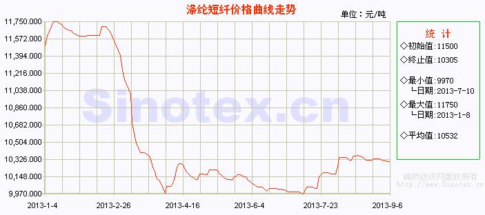 【錦橋紡織網(wǎng)專稿】本周(8.31-9.6),滌綸短纖僵持觀望為主,陰跌氣氛濃厚。時(shí)值月初,滌綸短纖觀望心態(tài)明顯,下游維持小單剛需補(bǔ)貨節(jié)奏,聚酯大盤整體表現(xiàn)沉靜。目前滌綸短纖企業(yè)產(chǎn)銷率在7成左右,平均庫(kù)存量在10天左右。本周上游原料PTA、MEG及聚酯切片有所走軟,對(duì)滌綸短纖支撐減弱;下游紗線企業(yè)開工率雖有一定程度改善,但對(duì)滌綸短纖實(shí)際需求量仍顯不足。9月6日,1.4Dx38mm滌綸短纖價(jià)格運(yùn)行在10305元/噸(比當(dāng)日國(guó)內(nèi)328級(jí)棉花現(xiàn)貨價(jià)格低8844元/噸),本周累計(jì)下跌25元/噸,跌幅0.24%。