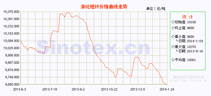 【錦橋紡織網(wǎng)專稿】2014年元月份第4周(1.18-24),滌綸短纖擴幅續(xù)跌。企業(yè)報價下滑,交投氣氛冷清,詢盤活動停滯,成交狀況下滑。受制于資金緊張及對后期悲觀預(yù)期,下游節(jié)前備貨規(guī)模遠低于預(yù)期。滌綸短纖企業(yè)產(chǎn)銷率下行,行業(yè)開機負(fù)荷降低,企業(yè)庫存量在半月左右水平。其原因,一是聚酯原料仍在下跌,對滌綸短纖支持力度不足;二是臨近春節(jié),下游企業(yè)開工率下滑,采購基本停頓。目前滌綸短纖進入半休市,節(jié)前備貨基本結(jié)束,預(yù)計春節(jié)前滌綸短纖弱勢僵持為主。1月24日,1.4Dx38mm滌綸短纖價格運行9680元/噸(比當(dāng)日國內(nèi)3128B級棉花現(xiàn)貨價格低9739元/噸),本周累計下跌70元/噸,跌幅0.72%。