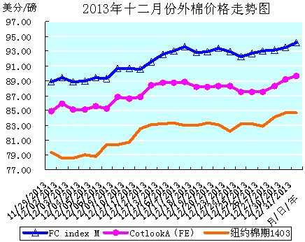 12月份全月統(tǒng)計(jì):紐約棉期1403合約累計(jì)大幅上漲5.29美分/磅,漲幅6.67%,月末運(yùn)行在84.64美分/磅價(jià)位上,又返回80美分/磅整數(shù)價(jià)位之上運(yùn)行。國際棉花價(jià)格指數(shù)CotlookA(FE)累計(jì)大幅上漲4.80美分/磅,漲幅5.65%,月末運(yùn)行在89.70美分/磅價(jià)位上。中國進(jìn)口棉價(jià)格指數(shù)FCIndexM累計(jì)大幅上漲5.34美分/磅,漲幅6.01%,月末運(yùn)行在94.19美分/磅價(jià)位上。12月末,中國進(jìn)口棉價(jià)格指數(shù)FCIndexM分別高于近期ICE期棉1403合約和國際棉花價(jià)格指數(shù)CotlookA(FE)9.55美分/磅、4.49美分/磅。(參見:表一和2013年12月份外棉價(jià)格走勢圖)