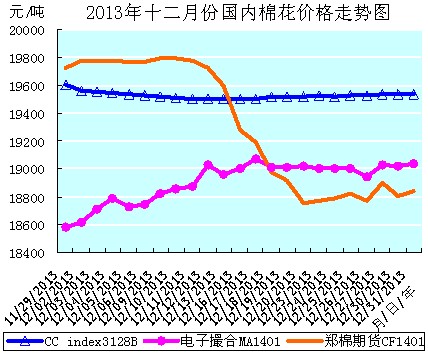 12月份全月統(tǒng)計(jì):中國棉花價(jià)格指數(shù)CCindex3128B累計(jì)小幅下降69元/噸,降幅0.35%,月末運(yùn)行在19534元/噸價(jià)位上;電子撮合1401合約累計(jì)超大幅上漲455元/噸,漲幅2.45%,月末運(yùn)行在19036元/噸價(jià)位上;鄭棉期貨1401合約累計(jì)超大幅下降885元/噸,降幅4.49%,月末運(yùn)行在18840元/噸價(jià)位上。月末,現(xiàn)貨CCindex3128B價(jià)格比電子撮合1401合約高498元/噸、比鄭棉期貨1401合約高694元/噸。(參見:表一和2013年12月份國內(nèi)棉花價(jià)格走勢圖)